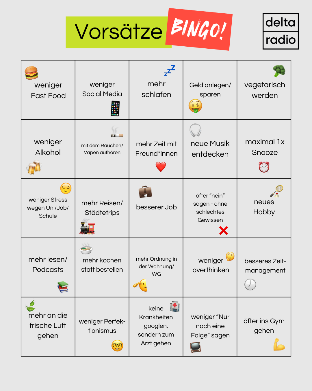 🎯 Markiert die Vorsätze der anderen Hörerinnen und Hörer auf unserer delta „Neujahrsvorsatz-Bullshit-Bingo“-Karte (findet ihr unterhalb).